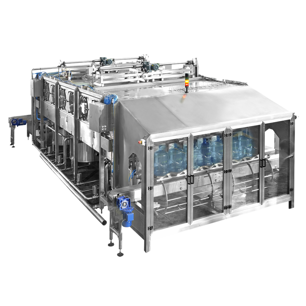 Suitable for three or five gallons Combines empty bottle loading, rinsing, unloading and outfeed in one machine